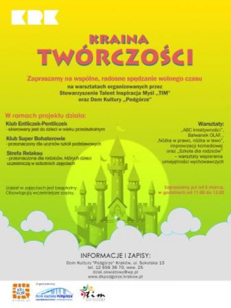 KRAINA TWÓRCZOŚCI - Jest to projekt, który zapewni dzieciom i ich rodzicom radosne spędzenie wolnego czasu na warsztatach organizowanych przez Stowarzyszenie Talent Inspiracja Myśl ,,TIM" oraz Dom Kultury ,,Podgórze". Projekt wyzwoli w dzieciach kreatywność, pobudzi wyobraźnię, odkryje ukryte talenty i rozwinie pasje. Spotkania organizowane są w dwie soboty miesiąca.