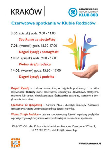 Jakie są samogłoski? Czy samogłoski mogą być straszne, wesołe albo zdziwione? Czy łatwo znaleźć samogłoski? I jakiego koloru one są? Czy mała samogłoska jest taka sama jak duża? Jeśli ktoś jest ciekawy to serdecznie zapraszamy do Klubu Rodziców w Klubie 303 Ośrodka Kultury Kraków-Nowa Huta (os. Dywizjonu 303 nr 1) na zajęcia Dogoń Żyrafę w dniu 7 czerwca o godz. 15.30-17.00. W tym dniu dowiemy się, w jakie zabawy można bawić się z dzieckiem, aby ćwiczyło „aparat mowy”. Nie zabraknie też paluszkowych wierszyków, rozgrzewki, zabaw z kolorową chustą czy tunelem. Tak więc, jeszcze raz serdecznie zapraszamy!