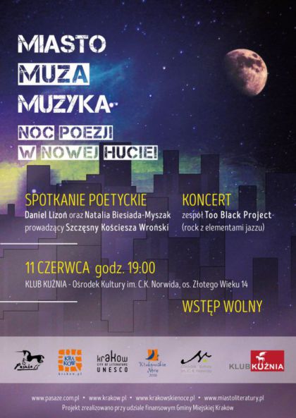 Spotkanie poetyckie z Danielem Lizoniem oraz Natalią Biesiadą-Myszak poprowadzi Szczęsny Kościesza Wroński. Następnie "Z dala od wielkich miast" – koncert krakowskiego zespołu Too Black Project. Wstęp wolny.