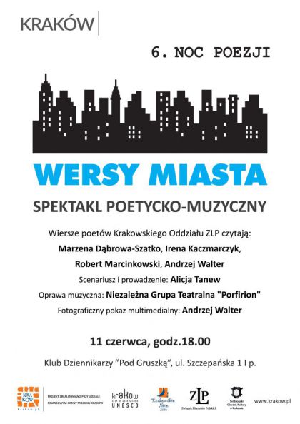 KRAKÓW W POEZJI. MIASTO W POEZJI – to hasła przewodnie tegorocznej 6. NOCY POEZJI. Wiersze poetów z Krakowskiego Oddziału Związku Literatów Polskich, czytają: