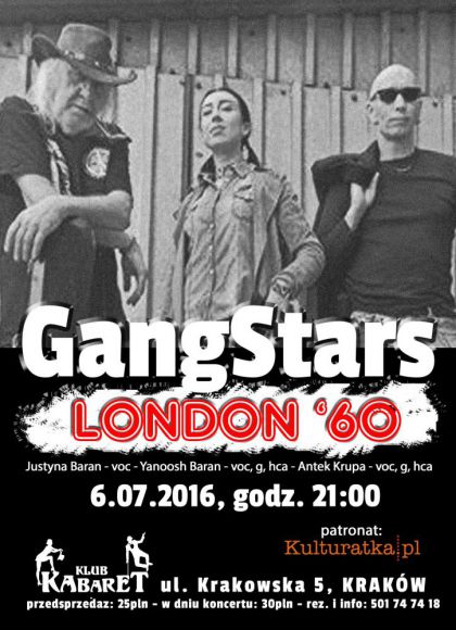 Zespół GangStars z Antonim Krupą (Radio Kraków) zaprasza na muzyczną podróż przez Londyn końca lat 60. Zaskakujące covery przebojów zespołów Jethro Tull, Free oraz artystów takich jak Janis Joplin czy Jimi'ego Hendrix'a.