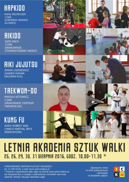 Letnia Akademia Sztuk Walki rusza już we czwartek 25 sierpnia 2016 o godz. 10.00. Przed nami zajęcia z Aiki Jujutsu, Taekwon-do, Kung Fu, Hapkido i Aikido. Każdego dnia inne sztuki walki. Zapraszamy na bezpłatne zajęcia dzieci ze szkół podstawowych i gimnazjów.