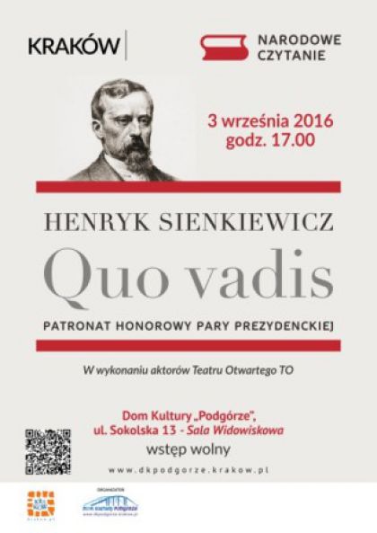 Rok 2016 ogłoszony został rokiem Henryka Sienkiewicza.3 września o godzinie 17.00 w Domu Kultury "Podgórze" odbędzie się Narodowe Czytanie "Quo vadis".