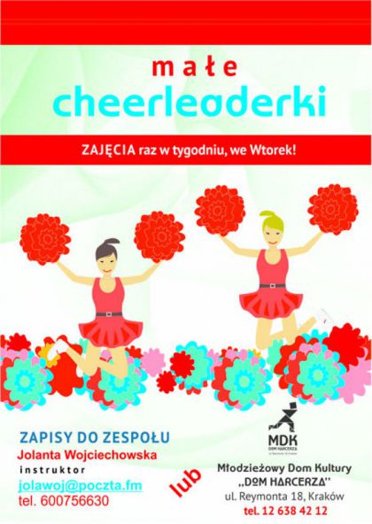 Cheerleaderki zapraszają na zajęcia we wtorki w godzinach od 17.40 do 19.15. Nowa sala baletowa, nowe wyzwania i możliwości! W ramach zespołu prowadzone są zajęcia dla Cheerleaderek z elementami tańca towarzyskiego. Wiek uczestników 6-12 lat. Zapraszamy!
