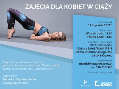 Zapraszam na pierwsze zajęcia poranne w Centrum Sportu IRBIS skierowane do kobiet w ciąży 14 lutego 2017. Treningi prowadzi Magdalena Pardela, fizjoterapeutka oraz certyfikowana trenerka Pelvic Floor Safe – PFS® – trening bezpieczny dla kobiet z włączeniem do zajęć ćwiczeń dna miednicy . Zajęcia dla kobiet już po 15 tygodniu ciąży.