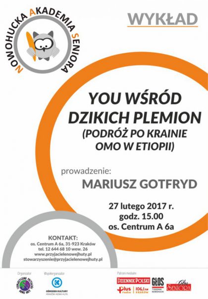 Nowohucka Akademia Seniora (os. Centrum A 6a) zaprasza na wykład w poniedziałek 27 lutego o godz. 15.00. "You wśród dzikich plemion" to multimedialna podróż po Etiopii, którą zamieszkują najdziksze plemiona Afryki: Konso, Mursi czy Hamerowie, którzy do niedawna nie wiedzieli nawet o istnieniu kontynentu Afrykańskiego. Autor podczas swojego pobytu poznawał ich kulturę i obyczaje. Pokaz wzbogacony zostanie eksponatami - pamiątkami podarowanymi autorowi przez rdzennych mieszkańców. Wykład dla Nowohuckiej Akademii Seniora poprowadzi Mariusz Gotfryd – podróżnik, nauczyciel geografii, autor przewodników. Organizatorami Nowohuckiej Akademii Seniora są Stowarzyszenie Przyjaciół Nowej Huty oraz Ośrodek Kultury Kraków-Nowa Huta.