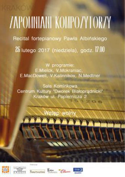 Recital z cyklu “Zapomniani Kompozytorzy” jest połączeniem slajdowiska z muzyką fortepianową wykonywaną na żywo. Oryginalna forma tego wydarzenia pozwala publiczności usłyszeć atrakcyjne i bardzo rzadko prezentowane utwory zmarłych już kompozytorów. Jednocześnie, dzięki zilustrowaniu slajdami słuchacze mają okazje poznać nieznaną im historię muzyki i biografię twórców. Archiwalne fotografie, opisane życiorysy, geograficzne szlaki twórczości i krajobrazy będą wzbogacać klasyczny recital fortepianowy. Audiowizualna forma wydarzenia nieustannie przyciąga cały czas rosnącą ilość słuchaczy. Koncert w wykonaniu pianisty Pawła Albińskiego, a w programie znajdą się nieznane kompozycje pochodzące z Włoch, USA czy Serbii. Wydarzenie zakończy premierowe w Polsce wykonanie utworów fińskiego kompozytora - Ernsta Mielcka (1877-1899).