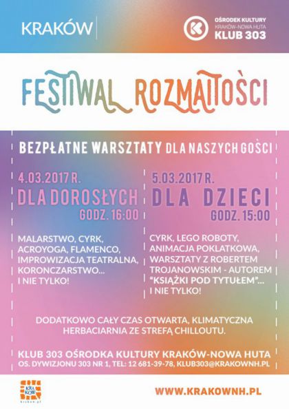Klub 303 Ośrodka Kultury Kraków-Nowa Huta serdecznie zaprasza wszystkich na dwa dni warsztatowej uczty. Pierwszego dnia - w sobotę 4 marca - od godz. 16.00 odbywać się będą warsztaty dla dorosłych. W tym roku dla tych, którzy odwiedzą Klub 303, organizatorzy przygotowali m. in. warsztaty tańca flamenco, acroyogę, wspólną improwizację teatralną czy naukę dziergania koronek. Drugiego dnia, w niedzielę 5 marca, Klub zaprasza na godz. 15.00 wszystkie dzieciaki. W programie znajdą się różnorodne warsztaty kreatywne, a wśród nich m.in. tworzenie animacji poklatkowych, programowanie lego robotów czy warsztaty z Robertem Trojanowskim - autorem "Książki pod tytułem"!