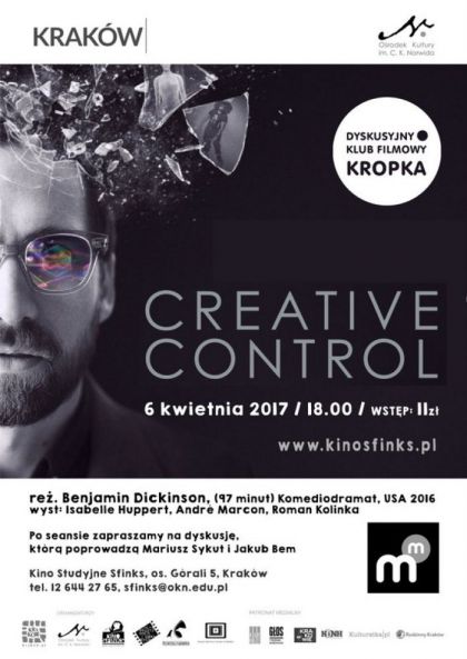 Dyskusyjny Klub Filmowy „Kropka” zaprasza 6 kwietnia o godz. 18.00 na film „Creative Control” w reż. Benjamina Dickinsona; po seansie zapraszamy na dyskusję, którą poprowadzą Mariusz Sykut i Jakub Bem.