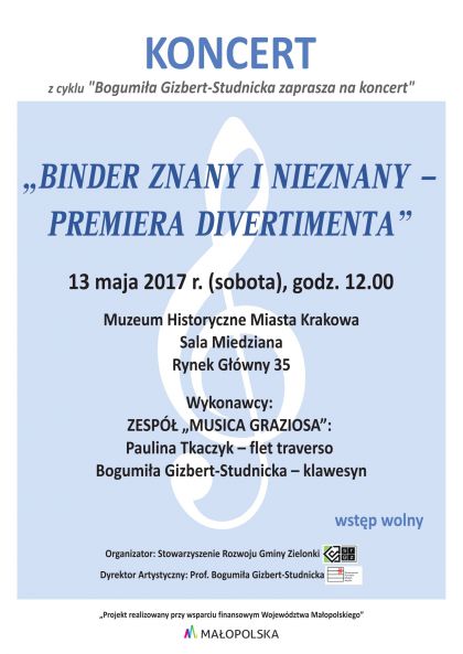 Serdecznie zapraszamy na niezwykły koncert muzyki barokowej „Binder znany i nieznany - premiera Divertimenta” (13.05, godz. 12, Muzeum Historyczne Miasta Krakowa), podczas którego zaprezentowane zostaną utwory Christlieba Siegmunda Bindera, muzyka drezdeńskiej kapeli, artysty dynamicznego, łączącego w swej twórczości wiele kierunków i stylów. Binder zafascynowany był klawesynem, tworzył głównie sonaty i koncerty na ten instrument. Już przez ówczesnych teoretyków muzyki uznawany był za kompozytora tworzącego z pasją, pełnego wyrazu i namiętności.