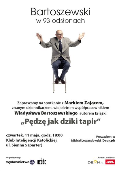Spotkanie z Markiem Zającem wokół książki “Pędzę jak dziki tapir. Bartoszewski w 93 odsłonach” odbędzie się w czwartek, 11 maja, o godz. 18.00 w Klubie Inteligencji Katolickiej, ul. Sienna 5. Poprowadzi je Michał Lewandowski (portal Deon.pl.