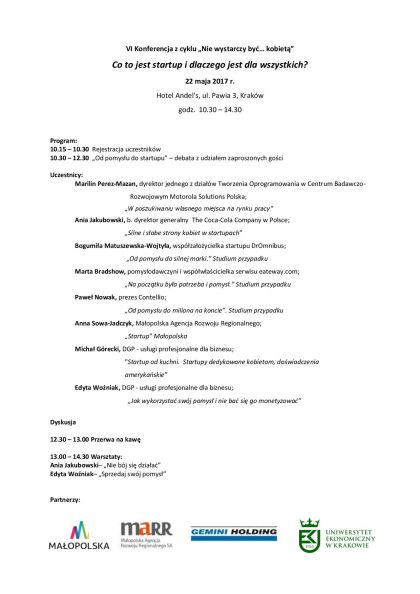 Kiedy pracowaliśmy nad tematem VI Konferencji „Nie wystarczy być… kobietą” i padła propozycja, by poświęcić ją startupom, nasze zdania były podzielone. Bo czym jest startup? Biznesem ze sformalizowaną strukturą? Pomysłem na biznes? Wykorzystaniem luki na rynku? Odpowiadającym na potrzeby światowych trendów pomysłem na realizację marzeń? A może zwyczajnie modą? Definicji startupów jest oczywiście wiele, modeli ich tworzenia i prowadzenia jeszcze więcej. Choć temat ten doczekał się już wielu publikacji naukowych i konferencji, to jednak ciągle bywa źle rozumiany. Bo czy startup musi być zbudowany na nowych technologiach? A może nowe technologie powinny być tylko narzędziem do stworzenia produktu albo usługi, która będzie w stanie konkurować na rynku? Pytań było jeszcze więcej. Postanowiliśmy zadać je naszym prelegentom jeszcze raz, ponieważ jesteśmy pewni, że w gąszczu doniesień na temat tej branży, na niektóre ciągle brakuje odpowiedzi. Ciągle też istnieje potrzeba edukowania w tym zakresie. Szczególnie kobiet, które, jak się wydaje, a potwierdzają to badania, unikają angażowania się w takie przedsięwzięcia.