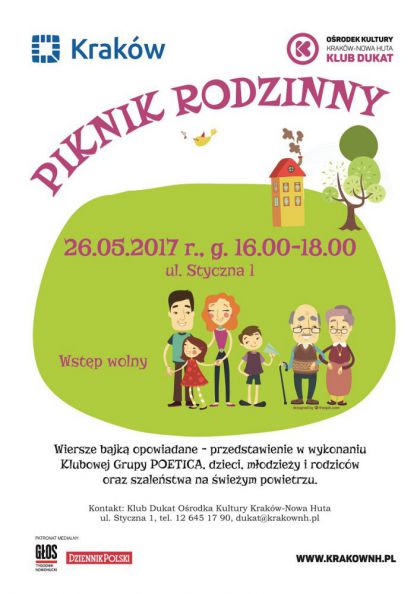 Klub Dukat Ośrodka Kultury Kraków-Nowa Huta (ul. Styczna 1) serdecznie zaprasza 26 maja w godz. 16.00-18.00 na Piknik rodzinny z okazji Dnia Rodziny. W programie znajdą się Wiersze bajką opowiadane w wykonaniu Klubowej Grupy POETICA, dzieci, młodzieży i rodziców oraz szaleństwa na świeżym powietrzu. Patronat medialny: Dziennik Polski, Głos. Tygodnik Nowohucki.