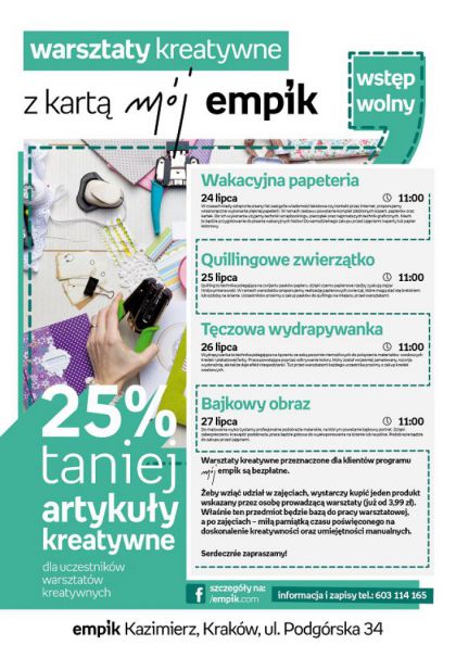 Zapraszamy do wzięcia udziału w warsztatach, które odbędą się w Empik Kazimierz. Warsztaty dedykowane są dla posiadaczy karty "Mój Empik". Aby wziąć udział, wystarczy zakupić jeden produkt bazowy wskazany przez osobę prowadzącą. Zapisy pod nr tel.: 603 114 165.