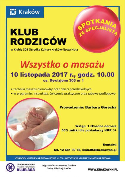 W ramach zajęć rodzice poznają techniki masażu niemowląt oraz dzieci przedszkolnych. W programie instruktaż, ćwiczenia praktyczne oraz zabawy podłogowe. Spotkanie poprowadzi Barbara Górecka - dyplomowana masażystka. Ukończyła Instytut Tradycyjnej Medycyny Ziołowej i Aromaterapii (The Institute of Traditional Herbal Medicine and Aromatherapy) w Londynie w 1998 roku. Posiada niezbędną wiedzę i wieloletnie doświadczenie zdobyte przez praktykowanie masażu w kraju i za granicą. Specjalistka w zakresie masażu w okresie ciąży oraz matek karmiących, posiada szeroką praktykę w tym zakresie oraz odpowiednie przeszkolenie zdobyte w Middlesex School of Complementary Medicine, The Evadell Natural Therapy Centre.
