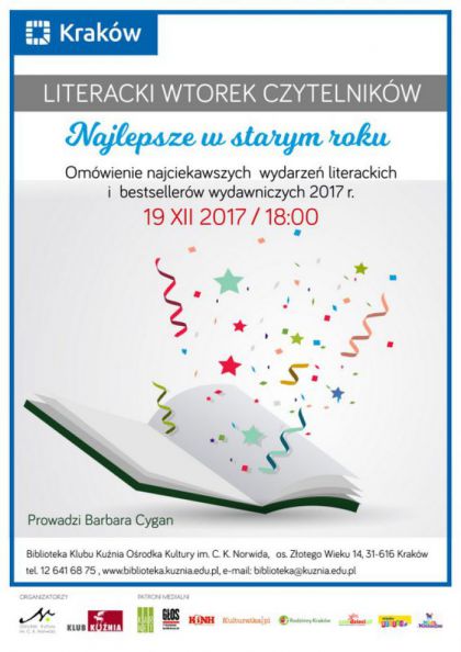 W 2017 roku pojawiło się wiele ciekawych debiutów literackich, nie zawiedli również pisarze mainstreamowi. Wydawnictwa trzymały poziom "wypuszczając" najgłośniejszych autorów z zagranicy oraz nadążając z najbardziej aktualnymi tematami współczesności. Co warto przeczytać, o czym warto wiedzieć? Zapraszamy na Wtorek Literacki podsumowujący mijający rok. Spotkanie prowadzi Barbara Cygan z Biblioteki Klubu Kuźnia.
