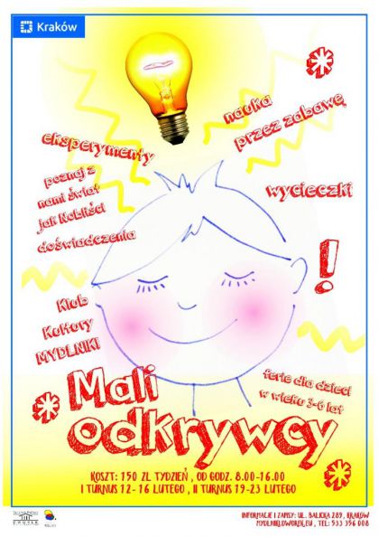 Zapraszamy wszystkich Małych Odkrywców na ferie w Klubie Kultury Mydlniki. Przed Wami dwa tygodnie wspaniałej zabawy, będzie dużo eksperymentów i doświadczeń, dzięki którym najmłodsi lepiej poznają otaczający nas świat, a zdobyte umiejętności i wiedzę nieraz wykorzystają w praktyce. A może uda nam się coś wynaleźć!