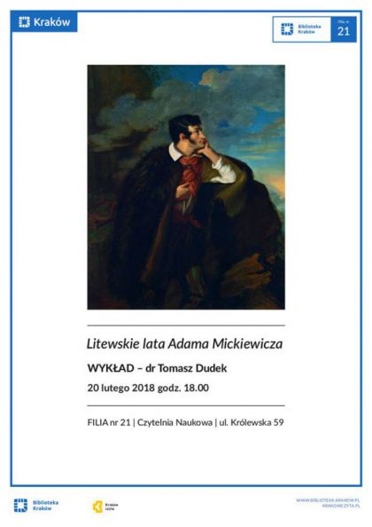 Zapraszamy na wykład „Litewskie lata Adama Mickiewicza” dra Tomasza Dudka – historyka, bibliotekarza i archiwistę, dra nauk humanistycznych w zakresie historii.