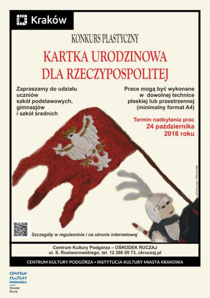 Zapraszamy do udziału w konkursie plastycznym „Kartka urodzinowa dla Rzeczypospolitej” organizowanym z okazji setnej rocznicy odzyskania niepodległości przez Polskę. Chcemy zachęcić dzieci i młodzież, by w ten sposób uhonorowały Jubilatkę.