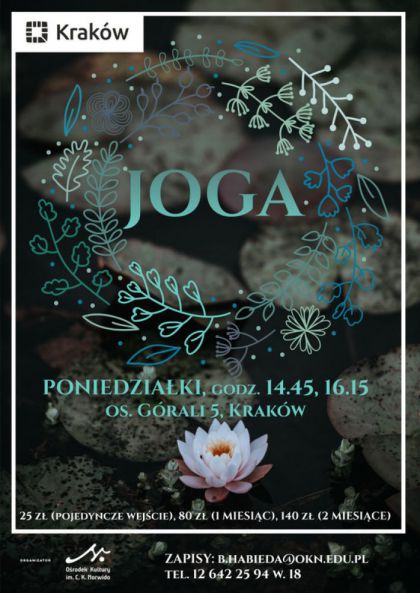 Joga znaczy połączenie ciała i umysłu. To system ćwiczeń / asan uruchamiający każdy układ w ciele włączając układ hormonalny. Efektem ubocznym praktykowania jogi są m.in.: dobre samopoczucie, poprawa kondycji psychofizycznej, polepszenie zdrowia, zadowolenie, elastyczność w ciele i umyśle. Program warsztatów jogi w Ośrodku Kultury Norwida obejmuje grupę ćwiczeń relaksacyjno-rehabilitacyjnych w oparciu o metodę Iyengara. Zajęcia odbywają się pod okiem doświadczonej nauczycielki – Kamili Berny.