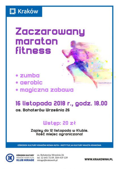 Klub Mirage Ośrodka Kultury Kraków-Nowa Huta (os. Bohaterów Września 26) zaprasza wszystkie zwolenniczki zdrowego i aktywnego stylu życia oraz dobrej zabawy do udziału w Zaczarowanym Maratonie Fitness, który odbędzie się 16 listopada. Początek o godz. 18.00. W programie zajęcia z aerobiku oraz zumby. Po fitnessowych zmaganiach na uczestniczki czeka pełen werwy i osobistego uroku, roztańczony i rozśpiewany wróżbita Radosław z tajemniczym i magicznym programem rozrywkowym. Zaczarowany Maraton Fitness to jedyna w swoim rodzaju impreza i potężna dawka pozytywnej energii. Serdecznie zapraszamy!
