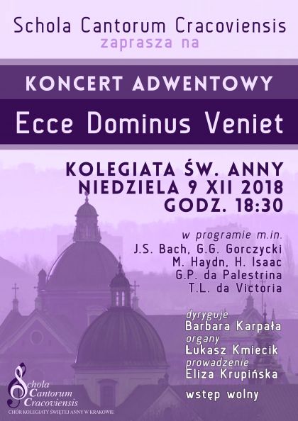 Chór Kolegiaty św. Anny Schola Cantorum Cracoviensis zaprasza na koncert adwentowy "Ecce Dominus Veniet" niedziela 9 grudnia 2018, godz. 18:30, Kolegiata św. Anny