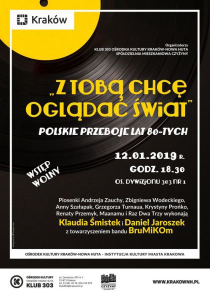 To właśnie muzyka lat 80-tych XX wieku i jej twórcy będą głównymi bohaterami wyjątkowego, karnawałowego koncertu, którego organizatorami są Klub 303 Ośrodka Kultury Kraków-Nowa Huta i Spółdzielnia Mieszkaniowa „Czyżyny”. Koncert „Z Tobą chcę oglądać świat” - polskie przeboje dekady lat 80-tych, rozpocznie się 12 stycznia 2019 roku o godz. 18.30 w sali Klubu 303, os. Dywizjonu 303 nr 1. Podczas koncertu wykonane zostaną między innymi Andrzeja Zauchy, Zbigniewa Wodeckiego, Anny Szałapak, Grzegorza Turnaua, Krystyny Prońko, Maanamu, ale też Renaty Przemyk i Raz Dwa Trzy. Różni artyści to różne style muzyczne, które zagoszczą podczas koncertu na klubowej scenie. Zgromadzeni usłyszą utwory, które były szlagierami w czasach swojej świetności, ale do których nadal chętnie wracamy i nucimy.
