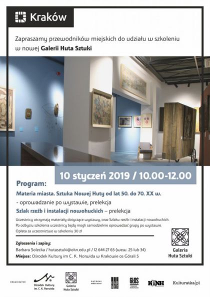 Galeria Huta Sztuki to nowe miejsce na mapie Nowej Huty. Dlatego zapraszamy przewodników miejskich do udziału w szkoleniu przygotowującym do oprowadzania po wystawie prezentowanej w nowej galerii - Materia miasta. Sztuka Nowej Huty od lat 50. do 70. XX w.