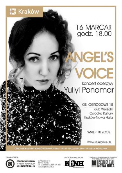 Najpiękniejsze przeboje z repertuaru znanych światowych śpiewaków operowych zabrzmią 16 marca w Klubie Wersalik Ośrodka Kultury Kraków-Nowa Huta (os. Ogrodowe 15) za sprawą koncertu "Angel's Voice". Przed słuchaczami wystąpi Yuliya Ponomar - absolwentka Narodowej Akademii Muzycznej im. P. I. Czajkowskiego w Kijowie oraz Akademii Muzycznej w Krakowie. Artystka zaśpiewa utwory Wojciecha Kilara i Davida Garretta, pieśni kojarzone z wykonaniami Andrei Bocellego, Sarah Brightman, Luciano Pavarottiego, Katelin Jenkins, Emmy Shapplin, Maleny Ernman czy grupy Il Divo.