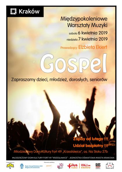 Zapraszamy dzieci, młodzież, dorosłych oraz seniorów do uczestnictwa w warsztatach gospel, które zakończą się koncertem finałowym z udziałem uczestników i profesjonalnych muzyków. Warsztaty będą dobrą okazja do wspólnego, międzypokoleniowego śpiewania na chwałę Pana.