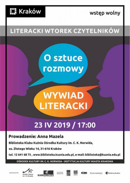 Literatura często rodzi się między ludźmi, w rozmowie, ale czy sama rozmowa może stać się treścią książki? Oczywiście, że tak, jednak tego typu dialog nie jest wcale sztuką łatwą. Warto zastanowić się, co gwarantuje sukces wywiadu, a także w czym tkwi największa wartość tego typu literackiej metody. Czy tematem rozmów zawsze jest biografia zaproszonego gościa czy może jego wiedza i subiektywna refleksja odnośnie określonych problemów naukowych, historycznych lub społecznych? Na spotkaniu omówione zostaną liczne przykłady i rodzaje tego typu wydawnictw, ze szczególnym uwzględnieniem polskiego rynku książki. Wstęp wolny.