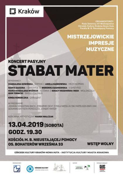 Koncert Pasyjny zatytułowany Stabat Mater odbędzie się w ramach cyklu Mistrzejowickie Impresje Muzyczne w sobotę 13 kwietnia o godzinie 19.30 w kościele Matki Bożej Nieustającej Pomocy na os. Bohaterów Września 33. Wykonawcami będą studenci akademii muzycznych w Poznaniu i Gdańsku oraz absolwenci krakowskich szkół muzycznych: Magdalena Sowińska – sopran, Aniela Mańkowska – mezzosopran, Marta Gadzina - I skrzypce, Weronika Bagniewska – II skrzypce, Maria Magdalena Wożniak – altówka, Ignacy Krzemiński-Iwan – wiolonczela, Igor Torbicki - basso continuo pod dyrekcją Kingi Kordeczka.