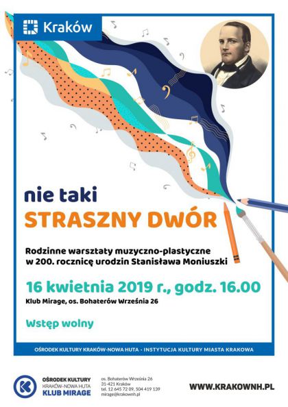 Klub Mirage Ośrodka Kultury Kraków-Nowa Huta (os. Bohaterów Września 26) zaprasza dzieci i rodziców 16 kwietnia o godz. 16.00 na warsztaty poświęcone Stanisławowi Moniuszce – jednemu z największych polskich kompozytorów, nazywanemu ojcem „polskiej opery narodowej”. Będzie to podróż po fascynującym świecie muzyki, pełnym różnorodnych instrumentów i dziwnych, obco brzmiących nazw, które na język polski, za sprawą twórczości Moniuszki, objaśni i przetłumaczy kwartet instrumentalny Golden Quartet. Uczestnicy warsztatów kontynuować będą tę podróż także w sposób bardzo realny, bo z pędzlami w ręku od sztalugi do sztalugi, tworząc wspólnie zupełnie niepowtarzalne dzieła malarskie.