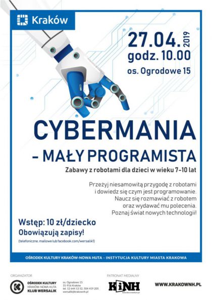 Klub Wersalik Ośrodka Kultury Kraków-Nowa Huta (os. Ogrodowe 15) zaprasza 27 kwietnia o godz. 10.00 na Cybermanie dla małych programistów. Przeżyj niesamowitą przygodę z photonami i dowiedz się czym jest programowanie. Nauczymy Cię jak rozmawiać z Robotem oraz wydawać mu polecenia. Będziesz miał okazję sterować robotem i wyznaczać trasę, którą photon będzie miał za zadanie pokonać. Być może programowanie zainteresuje Cię na tyle, aby zgłębiać jego tajniki i zostać w przyszłości programistą? Przyjdź i zobacz świat nowych technologii. Jeśli masz od 7 do 10 lat to nie może Cię u nas zabraknąć! NA WYDARZENIE WYMAGANE SĄ WCZEŚNIEJSZE ZAPISY (telefonicznie, mailowo lub przez Facebooka)