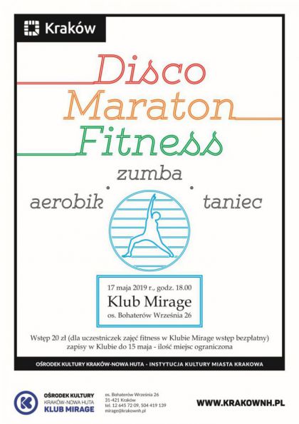 Klub Mirage Ośrodka Kultury Kraków-Nowa Huta (os. Bohaterów Września 26) zaprasza 17 maja od godz. 18.00 na Disco Maraton Fitness. Wiosna w pełni, nadszedł czas ładowania energii do organizmu. Aby w tym pomóc, zapraszamy w piątkowe popołudnie na Disco Maraton Fitness. Instruktorzy czekają na zwolenniczki zdrowego i aktywnego stylu życia oraz dobrej zabawy od godziny 18:00. W programie zajęcia aerobiku i zumby, a po fitnessowych zmaganiach - zabawa w rytmie muzyki disco. Miło widziane przebrania w stylu lat 80-tych, a najciekawszy strój zostanie nagrodzony.