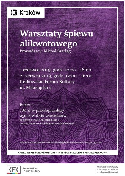 Bilety: 180 zł – przedsprzedaż, 250 zł – w dniu warsztatów, dostępne na stronie bilety.krakowskieforum.pl lub w siedzibie KFK