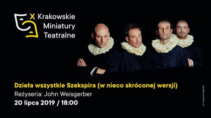 Ta żartobliwa sztuka została napisana dwadzieścia lat temu przez trzech amerykańskich studentów i od tego czasu cieszy się niesłabnącym powodzeniem, zarówno w Londynie (przez kilkanaście lat była grana w Teatrze Criterion przy Piccadilly Circus na londyńskim West Endzie), jak i w Polsce. Reżyserem przedstawienia jest specjalista od Szekspira – Kanadyjczyk – John Weisgerber, który na scenie Teatru Polonia wystawił uwielbiany przez publiczność spektakl Klaps! 50 twarzy Greya. Adam Krawczuk, Marcin Perchuć, Rafał Rutkowski i Maciej Wierzbicki – aktorzy Teatru Montownia, podejmą się zadania z pozoru niemożliwego: przedstawią Widzom wszystkie dzieła Szekspira w ciągu jednego wieczoru! Będą cytaty z najsławniejszych dramatów, żarty ze stereotypowej znajomości dzieł słynnego twórcy, a także m.in. Tytus Andronikus w programie kulinarnym i Hamlet w wersji przyspieszonej. Widzowie mogą spodziewać się nieustającej zabawy, będą zapraszani do udziału w akcji. Spektakl obnaża powierzchowną znajomość Szekspira, do czego przyczyniła się kultura masowa.