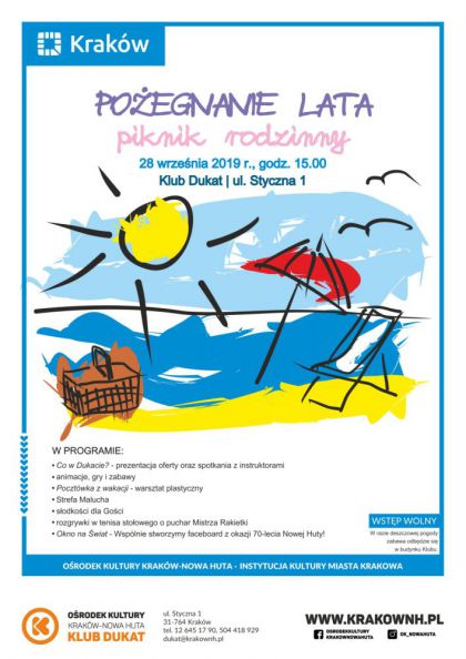 Klub Dukat Ośrodka Kultury Kraków-Nowa Huta (ul. Styczna 1) zaprasza w sobotę 28 września od godz. 15.00 na Pożegnanie Lata – rodzinny piknik. Na uczestników czeka wiele atrakcji! Od gier i animacji poprzez warsztaty plastyczne aż po rozgrywki w tenisa stołowego. Z okazji 70-lecia Nowej Huty wspólnie stworzymy również faceboard przedstawiający jej wizerunek.