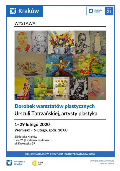 Wernisaż wystawy dorobku warsztatów plastycznych prowadzonych przez Urszulę Tatrzańską, artystę plastyka. Na wernisażu prace zaprezentują twórcy nieprofesjonalni, uczestnicy zajęć, którzy tworzą samodzielnie, doskonaląc umiejętności podczas spotkań z artystką.Prace swoje zaprezentują również artyści którzy opuścili już nasze warsztaty.
