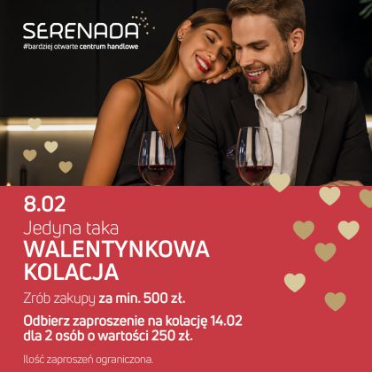 Już 8 lutego, klienci Serenady robiąc zakupy za co najmniej 500 zł, będą mogli otrzymać zaproszenie dla dwóch osób na specjalną, walentynkową kolację o wartości 250 zł. Wydarzenie odbędzie się 14 lutego o godzinie 19.00 w Serenadzie.