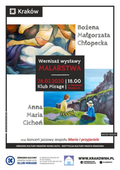Klubie Mirage Ośrodka Kultury Kraków-Nowa Huta zaprasza na wystawę malarstwa Bożeny Małgorzaty Chłopeckiej i Anny Marii Cichoń. Wernisaż wystawy odbędzie się w 28 lutego (piątek) o godz. 18.00. w Galerii M Plus Klubu Mirage. Wydarzenie uświetni koncert jazzowy w wykonaniu zespołu Mario i przyjaciele.