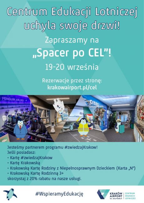 W weekend, 19-20 września, Centrum Edukacji Lotniczej w Balicach zaprasza na „Spacer po CEL”, czyli ekscytującą wycieczkę po jedynym w Polsce ośrodku popularyzującym wiedzę z zakresu lotnictwa cywilnego. Będzie można zwiedzić sale zaaranżowane na terminal pasażerski i wnętrze samolotu, wcielić się w rolę pasażera lub stewardessy, a nawet, dzięki rzeczywistości wirtualnej, zaparkować samolot na płycie lotniska.
