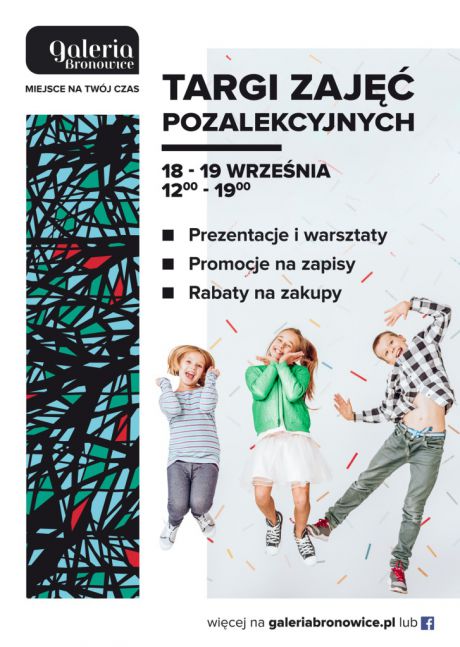 W dniach 18-19 września, w godz. 12.00-19.00, w Galerii Bronowice odbędą się Targi Zajęć Pozalekcyjnych, na których pojawi się ponad 40 wystawców. Będzie można dowiedzieć się tu, jaką propozycję mają dla dzieci i młodzieży placówki edukacyjne, artystyczne, sportowe czy kreatywne. Szeroką gamę proponowanych zajęć uzupełnią rabaty na wyprawkę szkolną obowiązujące w wybranych sklepach, a także warsztaty kreatywne na poszczególnych stoiskach.