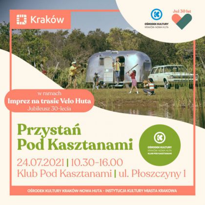 Z okazji jubileuszu 30-lecia Ośrodka Kultury Kraków-Nowa Huta Klub Pod Kasztanami zaprasza na warsztaty połączone z zabawami pod wspólną nazwą Przystań pod Kasztanami. Przemierzając rowerem szlak Velo Huta warto tak zaplanować jazdę, aby właśnie 24 lipca w godzinach 10.30-16.00 dotrzeć do os. Kościelniki i tam spędzić miłe przed lub popołudnie. Klub zaplanował moc warsztatowych atrakcji. Pokazy eksperymentów fizycznych i chemicznych, zabawy sportowe oraz okolicznościowe - jubileuszowe malowanie twarzy i sesja zdjęciowa, będą czekać na wszystkich, którzy w tym dniu dotrą do Klubu.