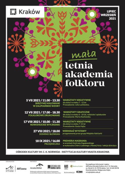 ARTzona Ośrodka Kultury im. C. K. Norwida zaprasza dzieci w wieku 7-12 lat na warsztaty kreatywne pt. „Nowohuckie wycinanki” odbywające się w ramach Małej LETNIEJ AKADEMII FOLKLORU. Podczas warsztatów uczestnicy poznają historię i sztukę wycinankarstwa, tradycje związane z tym rodzajem sztuki ludowej. Na koniec zajęć dzieci wykonają tradycyjne wycinanki z papieru inspirowane wzorami pochodzącymi z regionu Małopolska.