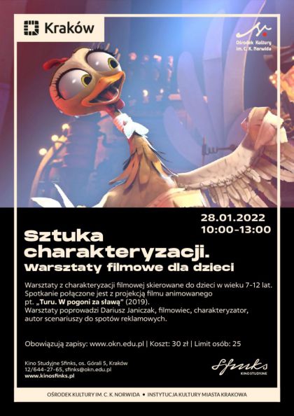Zapraszamy wszystkie dzieci w wieku 7-12 lat do Studyjnego Kina Sfinks w Ośrodku Kultury im. C.K. Norwida na warsztaty z charakteryzacji filmowej połączone z seansem filmu animowanego pt. „Turu. W pogoni za sławą” (reż. Eduardo Gondell, Víctor Monigote, 2019). Zajęcia rozpoczną się o godzinie 10:00 w dużej sali kina Sfinks i potrwają do 13:00. Podczas spotkania dzieci dowiedzą się czym na planie filmu zajmuje się charakteryzator, w jaki sposób powstają rany, jak namalować bliznę czy dokleić sztuczny nos, czyli w jaki sposób przebiegają filmowe metamorfozy. Podczas warsztatów dzieci przemienią się w postaci z niezwykłych światów, a następnie zrealizują krótki film, do którego przygotują własną charakteryzacje.