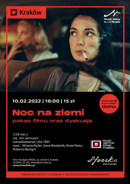 Dyskusyjny Klub Filmowy "Kropka" zaprasza na film „Noc na ziemi” w reż. Jima Jarmuscha (Komediodramat, USA 1991, wyst.: Winona Ryder, Gena Rowlands, Rosie Perez, Roberto Benigni).