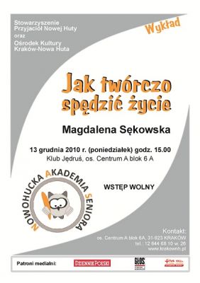 To już drugi wykład Magdaleny Sękowskiej w ramach Nowohuckiej Akademii Seniora. Na kolejnej prelekcji z dziedziny psychologii zaprezentuje i doradzi ona, w jaki sposób twórczo spędzić życie. Zapraszają: Stowarzyszenie Przyjaciół Nowej Huty i Ośrodek Kultury Kraków-Nowa Huta.
