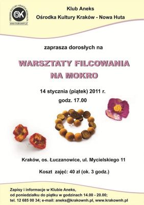 Klub Aneks Ośrodka Kultury Kraków – Nowa Huta organizuje warsztaty wykonywania biżuterii – broszki techniką filcowania na mokro w dniu 14 stycznia 2011 r. o godz. 17.00.