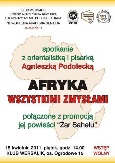 15 kwietnia 2011 r. o godz. 14.00 w Klubie Wersalik Ośrodka Kultury Kraków - Nowa Huta (os. Ogrodowe 15) odbędzie się spotkanie z orientalistką i pisarką Agnieszką Podolecką dotyczące jej podróży po czarnym lądzie, połączone z promocją powieści Żar Sahelu.